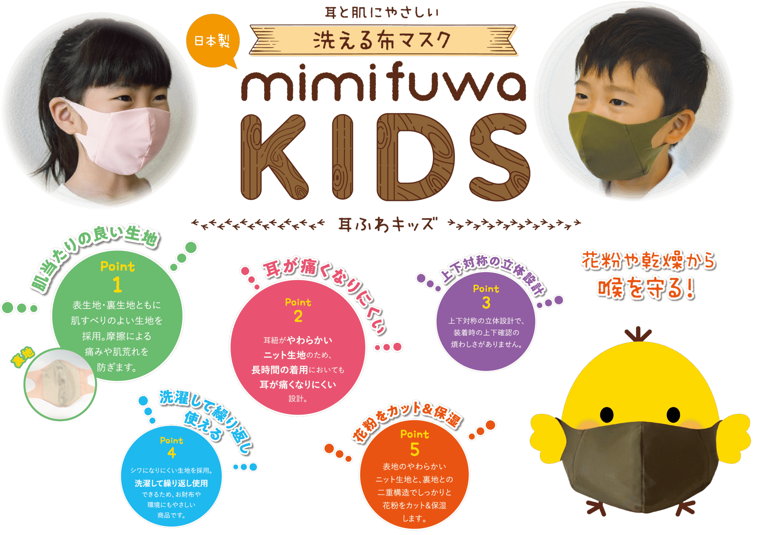 “Mặt nạ Mimifuwa” phổ biến (https://www.topman-ind.co.jp/2019/11/01/mimifuwamask/), dịu nhẹ cho tai và da ,hiện có phiên bản dành cho trẻ em có tên là ” Mimifuwa KIDS “! Da trẻ em nhạy cảm hơn da người lớn. ” Mimi Fuwa KIDS ” sử dụng vải sợi micro nylon nhiều lớp, có độ co giãn cao, giúp giảm áp lực lên tai . Hơn nữa, chất liệu vải